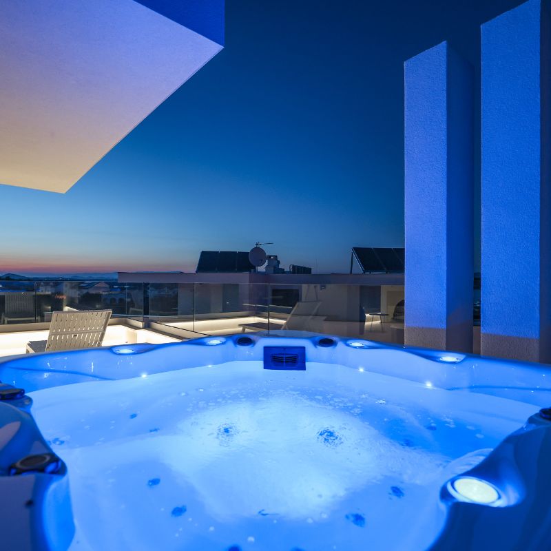 A mosaic glass-tiled pool that twinkles at night, combined with a rooftop terrace featuring a jacuzzi and panoramic glass walls, creates a unique look and a special ambience.